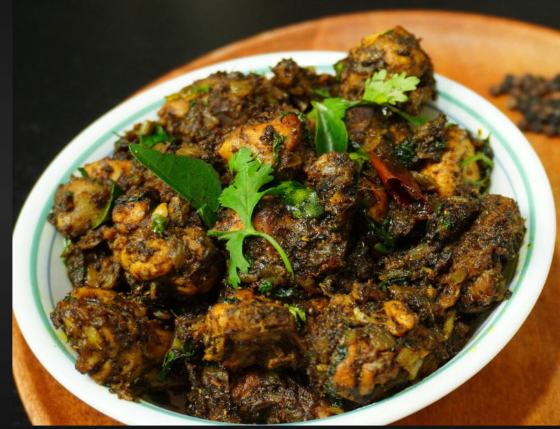 Succulent chicken pieces cooked with freshly ground black pepper, aromatic spices, and herbs, offering a flavorful and aromatic dish with a spicy kick.