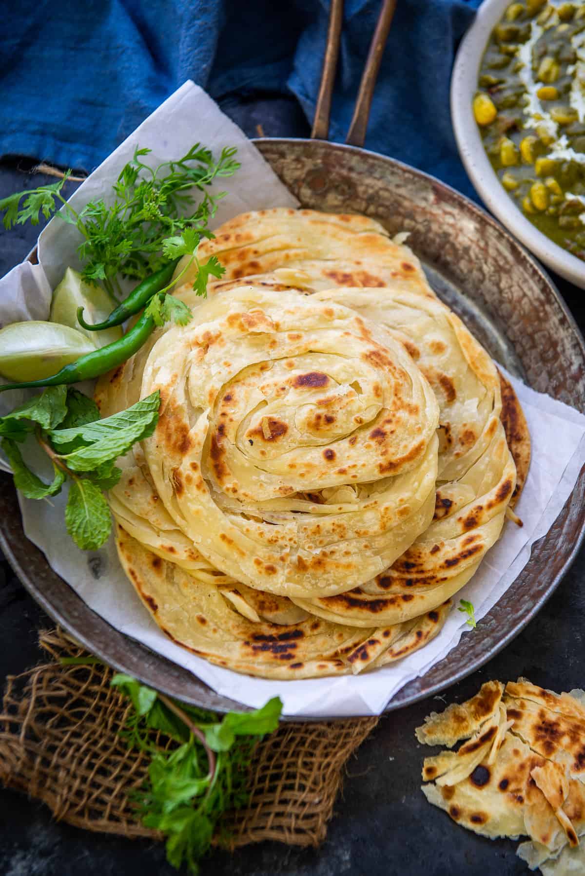 Flaky, layered South Indian flatbread made with flour, oil, and water, perfect for sopping up curries or enjoying with spicy side dishes.